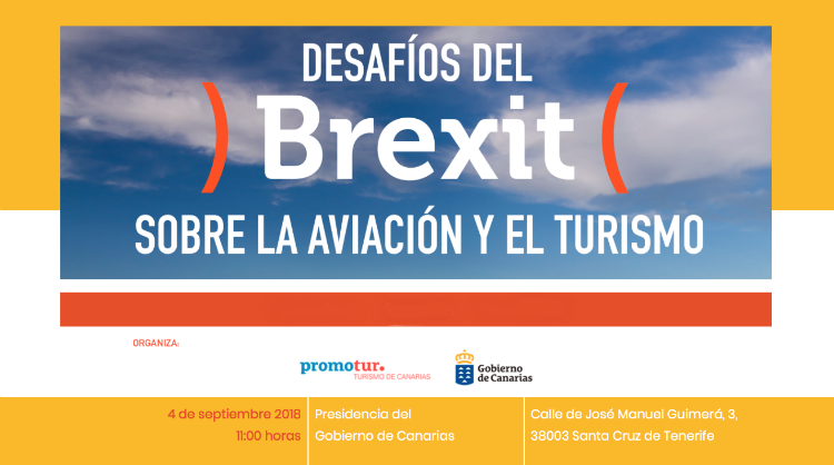 Promotur Turismo de Canarias organiza una jornada para analizar el impacto del Brexit en el sector turístico y en la aviación el próximo martes 4 de septiembre, de 11:00 a 13:00 horas, en la sede de Presidencia en Santa Cruz de Tenerife. El encuentro será inaugurado por Fernando Clavijo, presidente del Gobierno de Canarias.