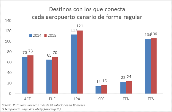 Según el análisis realizado para el último año turístico (desde abril de 2015 a marzo de 2016) por Promotur, las Islas Canarias siguen avanzando en lo que a conectividad regular se refiere ya que el número de orígenes con los que está conectado el archipiélago aumentó en 6 hasta situarse en 149, siendo Gran Canaria la isla que logró un mayor avance.